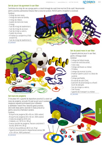info@bdidact.ro %u2022 www.bdidact.ro %u2022 +40 746 104 545SportCon%u021binut:%u2022 2 mingi de mini-tenis,%u2022 1 minge de tenis de familie,%u2022 2 mingi de ribbon,%u2022 4 pale%u021bi de tenis de mas%u0103,%u2022 2 mingi,%u2022 1 set de mingi de badminton I,%u2022 1 set de mingi de aruncat,%u2022 1 set de mingi cu velcro,%u2022 2 pale%u021bi de scoop,%u2022 4 frisbee (cu acoperire %u0219i f%u0103r%u0103 acoperire),%u2022 1 set de mingi de badminton II.BZ_BD50687Set de jocuri de agrement %u00een aer liberCantitatea de mingi din sac ajunge pentru o clas%u0103 %u00eentreag%u0103 de copii (mai mult de 20 de copii). Recomandat pentru practic%u0103, petrecerea timpului liber %u0219i excursii %u0219colare. Potrivit pentru %u00eencep%u0103tori %u0219i avansa%u021bi.Set de joac%u0103 mare %u00een aer liberO geant%u0103 plin%u0103 de jocuri %u00een aer liber, pentru %u00eentreaga clas%u0103!Con%u021binut:%u2022 1 minge de fotbal moale, %u2022 1 cutie de cret%u0103 de asfalt, %u2022 1 mini roler, %u2022 1 minge s%u0103ritoare cu m%u00e2ner, %u2022 1 frisbee,%u2022 1 minge de aruncat %u0219i prins, %u2022 3 hamuri (pentru jocuri cu c%u0103lu%u021bi de juc%u0103rie), %u2022 1 minge gonflabil%u0103, %u2022 10 coarde de s%u0103rit (3m), %u2022 3 perechi de picioroange cu sfoar%u0103 (cutii de alergat), %u2022 1 joc de minge cu velcro, %u2022 1 set Scoop, %u2022 1 geant%u0103 de transport cu m%u00e2ner.BZ_BD53895Jonglarea regulat%u0103 promoveaz%u0103 jocul reflexelor %u0219i abilit%u0103%u021bilor motorii fine. Datorit%u0103 gen%u021bii practice, setul este ideal pentru exerci%u021bii %u00een clas%u0103, precum %u0219i pentru excursii %u0219i festivaluri %u0219colare.Con%u021binut:%u2022 10 e%u0219arfe de jonglerie (65 x 65 cm, 100% nailon)%u2022 10 e%u0219arfe de jonglerie (40 x 40 cm, 100% nailon)%u2022 3 inele de jonglerie,( %u00d8 24 cm)%u2022 2 diabolo-uri, ( %u00d8 10 cm, 165 g)%u2022 3 seturi de bile de jonglerie, fiecare con%u021bin%u00e2nd 3 buc%u0103%u021bi, (%u00d8 60 mm, 80 g)%u2022 3 farfurii de echilibrare (%u00d8 22 cm, 70 g)%u2022 1 geant%u0103 practic%u0103 pentru depozitarea setului (66 x 33 x 28 cm, 100% poliester)BZ_BD33659Set mare de jonglerie37 de piese %u00eentr-o geant%u0103 de depozitare practic%u0103 Cu acest set mare de jonglerie, cel pu%u021bin 16 copii se pot juca %u00een acela%u0219i timp. 333