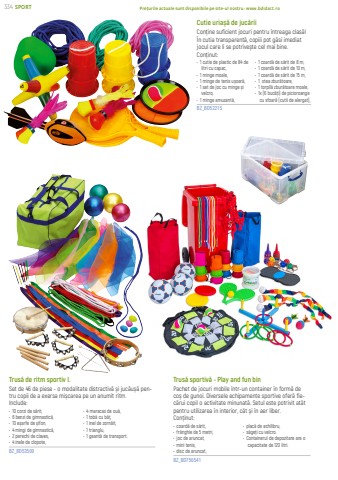 SPORTPre%u021burile actuale sunt disponibile pe site-ul nostru: www.bdidact.ro Trus%u0103 de ritm sportiv I.Set de 46 de piese - o modalitate distractiv%u0103 %u0219i juc%u0103u%u0219%u0103 pentru copii de a exersa mi%u0219carea pe un anumit ritm.Include:%u2022 10 corzi de s%u0103rit,%u2022 6 benzi de gimnastic%u0103,%u2022 10 e%u0219arfe de %u0219ifon,%u2022 4 mingi de gimnastic%u0103,%u2022 2 perechi de claves,%u2022 4 inele de clopote,%u2022 4 maracas de ou%u0103,%u2022 1 tob%u0103 cu b%u0103%u021b,%u2022 1 inel de zorn%u0103it,%u2022 1 trianglu,%u2022 1 geant%u0103 de transport.BZ_BD53500Trus%u0103 sportiv%u0103 - Play and fun binPachet de jocuri mobile %u00eentr-un container %u00een form%u0103 de co%u0219 de gunoi. Diversele echipamente sportive ofer%u0103 fiec%u0103rui copil o activitate minunat%u0103. Setul este potrivit at%u00e2t pentru utilizarea %u00een interior, c%u00e2t %u0219i %u00een aer liber.Con%u021binut: %u2022 coard%u0103 de s%u0103rit, %u2022 fr%u00e2nghie de 5 metri, %u2022 joc de aruncat, %u2022 mini tenis, %u2022 disc de aruncat, %u2022 plac%u0103 de echilibru, %u2022 s%u0103ge%u021bi cu velcro.%u2022 Containerul de depozitare are o capacitate de 120 litri.BZ_BD756541Cutie uria%u0219%u0103 de juc%u0103riiCon%u021bine suficient jocuri pentru %u00eentreaga clas%u0103! %u00cen cutia transparent%u0103, copiii pot g%u0103si imediat jocul care li se potrive%u0219te cel mai bine.Con%u021binut:%u2022 1 cutie de plastic de 84 de litri cu capac,%u2022 1 minge moale,%u2022 1 minge de tenis u%u0219oar%u0103,%u2022 1 set de joc cu minge %u0219i velcro,%u2022 1 minge amuzant%u0103,%u2022 1 coard%u0103 de s%u0103rit de 8 m,%u2022 1 coard%u0103 de s%u0103rit de 10 m,%u2022 1 coard%u0103 de s%u0103rit de 15 m,%u2022 1 stea zbur%u0103toare,%u2022 1 torpil%u0103 zbur%u0103toare moale,%u2022 1x (6 buc%u0103%u021bi) de picioroange cu sfoar%u0103 (cutii de alergat),BZ_BD52215334