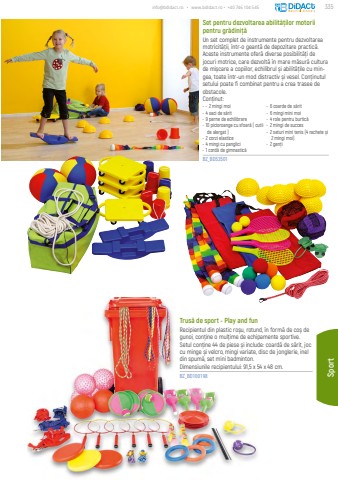 info@bdidact.ro %u2022 www.bdidact.ro %u2022 +40 746 104 545SportTrus%u0103 de sport - Play and funRecipientul din plastic ro%u0219u, rotund, %u00een form%u0103 de co%u0219 de gunoi, con%u021bine o mul%u021bime de echipamente sportive.Setul con%u021bine 44 de piese %u0219i include: coard%u0103 de s%u0103rit, joc cu minge %u0219i velcro, mingi variate, disc de jonglerie, inel din spum%u0103, set mini badminton.Dimensiunile recipientului: 91,5 x 54 x 48 cm.BZ_BD100198Set pentru dezvoltarea abilit%u0103%u021bilor motorii pentru gr%u0103dini%u021b%u0103Un set complet de instrumente pentru dezvoltarea motricit%u0103%u021bii, %u00eentr-o geant%u0103 de depozitare practic%u0103. Aceste instrumente ofer%u0103 diverse posibilit%u0103%u021bi de jocuri motrice, care dezvolt%u0103 %u00een mare m%u0103sur%u0103 cultura de mi%u0219care a copiilor, echilibrul %u0219i abilit%u0103%u021bile cu mingea, toate %u00eentr-un mod distractiv %u0219i vesel. Con%u021binutul setului poate fi combinat pentru a crea trasee de obstacole.Con%u021binut: %u2022 %u2022 2 mingi moi%u2022 4 saci de s%u0103rit%u2022 9 perne de echilibrare%u2022 10 picioroange cu sfoar%u0103 ( cutii de alergat )%u2022 2 corzi elastice%u2022 4 mingi cu panglici%u2022 1 cord%u0103 de gimnastic%u0103%u2022 6 coarde de s%u0103rit%u2022 6 mingi mini moi%u2022 4 role pentru burtic%u0103%u2022 2 mingi de succes%u2022 2 seturi mini tenis (4 rachete %u0219i 2 mingi moi)%u2022 2 gen%u021biBZ_BD53501335