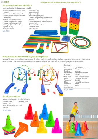 SPORTPre%u021burile actuale sunt disponibile pe site-ul nostru: www.bdidact.ro Set de conuri colorateSet de conuri versatil, %u00een culori vibrante. %u2022 %u00cen%u0103l%u021bime: 30 cm %u2022 L%u0103%u021bime: 23 cm%u2022 Ad%u00e2ncime: 23 cm.Fabricat din plastic, cu 2 ani garan%u021bie.BZ_BD754493Set mare de dezvoltare a mi%u0219c%u0103rilor 2.Con%u021binutul kitului de dezvoltare a mi%u0219c%u0103rii:%u2022 8 corpuri de c%u0103r%u0103mid%u0103 (29,5 cm x 15 cm x 10 cm).%u2022 3 trepte albastre (80cm x 14,5cm x 2cm)%u2022 12 conuri (%u00een%u0103l%u021bime 31cm, baz%u0103 cu diametrul de 24cm)%u2022 4 cercuri mari (diametru 60 cm)%u2022 4 cercuri medii (diametru 49,5 cm)%u2022 4 cercuri mici (diametru 35 cm)%u2022 4 triunghiuri (37cm x 37cm x 37cm)%u2022 4 p%u0103trate (43 cm)%u2022 4 tije lungi (70 cm) %u2022 8 tije medii (35cm)%u2022 10 tije mici (10cm)%u2022 8 tije mini (6cm)%u2022 16 bare lungi %u0219i plate (98cm)%u2022 1 element de leg%u0103tur%u0103 ro%u0219u (15,5 cm x 7 cm x 3,5 cm)%u2022 2 elemente de leg%u0103tur%u0103 galbene (15,5 cm x 15 cm x 5 cm) %u2022 12 elemente de fixare albastre%u2022 4 perechi de palme%u2022 4 perechi de t%u0103lpiSJK_ST-033Con%u021binut:%u2022 12 semi-c%u0103r%u0103mizi%u2022 8 c%u0103r%u0103mizi%u2022 4 sc%u00e2nduri de echilibrare,%u2022 4 cercuri de 35 cm,%u2022 4 cercuri de 50 cm,%u2022 4 cercuri de 60 cm,%u2022 16 tije de 35 cm,%u2022 8 tije de 70 cm,%u2022 12 tije %u0219i cleme de fixare a cercurilor,%u2022 12 piese pentru conectarea tijelor%u2022 10 saci cu boabe(beanbag),%u2022 5 perechi de amprente de m%u00e2ini,%u2022 5 perechi de amprente de picioare.%u2022 geant%u0103SJK_ST-005KLTKit de dezvoltare a mi%u0219c%u0103rii MAXI cu geant%u0103 de depozitareSetul de 114 piese include blocuri de construc%u021bie, tuburi, saci cu boabe(beanbag) %u0219i alte echipamente pentru a dezvolta coordonarea motorie. Este ideal pentru diferite grupe de v%u00e2rst%u0103, satisf%u0103c%u00e2nd toate nevoile de exerci%u021bii legate de acest subiect. 344