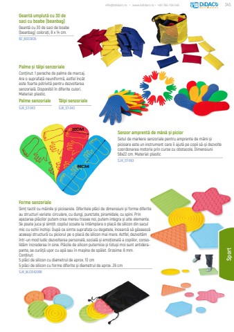 info@bdidact.ro %u2022 www.bdidact.ro %u2022 +40 746 104 545SportGeant%u0103 umplut%u0103 cu 30 de saci cu boabe (beanbag)Geant%u0103 cu 30 de saci de boabe (beanbag) colora%u021bi, 8 x 14 cm. BZ_BD33826Palme %u0219i t%u0103lpi senzorialeCon%u021binut: 1 pereche de palme de marcaj.Are o suprafa%u021b%u0103 neuniform%u0103, astfel %u00eenc%u00e2t este foarte potrivit%u0103 pentru dezvoltarea senzorial%u0103. Disponibil %u00een diferite culori.Material: plastic.Palme senzorialeSJK_ST-043T%u0103lpi senzorialeSJK_ST-042Senzor amprent%u0103 de m%u00e2n%u0103 %u0219i piciorSetul de markere senzoriale pentru amprente de m%u00e2ini %u0219i picioare este un instrument care %u00eei ajut%u0103 pe copii s%u0103-%u0219i dezvolte coordonarea motorie prin curse cu obstacole. Dimensiuni: 58x22 cm. Material: plasticSJK_ST-063Forme senzorialeSim%u021b tactil cu m%u00e2inile %u0219i picioarele. Diferitele pl%u0103ci de dimensiuni %u0219i forme diferite au structuri variate: circulare, cu dungi, punctate, piramidale, cu spini. Prin a%u0219ezarea pl%u0103cilor putem crea mereu trasee noi, putem integra %u0219i alte elemente. Se poate juca %u0219i sim%u021bit: copilul scoate la %u00eent%u00e2mplare o plac%u0103 de silicon din sacul mic cu ochii %u00eenchi%u0219i. Dup%u0103 ce simte suprafa%u021ba cu degetele, %u00eencearc%u0103 s%u0103 g%u0103seasc%u0103 aceea%u0219i structur%u0103 cu piciorul pe o plac%u0103 de silicon mai mare. Astfel, dezvolt%u0103m %u00eentr-un mod ludic dezvoltarea personal%u0103, social%u0103 %u0219i emo%u021bional%u0103 a copiilor, consolid%u0103m %u00eencrederea %u00een sine. Pl%u0103cile de silicon puternice %u0219i totu%u0219i moi sunt antiderapante, se cur%u0103%u021b%u0103 u%u0219or cu ap%u0103 sau %u00een ma%u0219ina de sp%u0103lat. Grosime: 6 mm.Con%u021binut:5 pl%u0103ci de silicon cu diametrul de aprox. 10 cm5 pl%u0103ci de silicon cu forme diferite %u0219i diametrul de aprox. 26 cmSJK_MJ2042098345