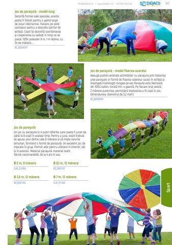 info@bdidact.ro %u2022 www.bdidact.ro %u2022 +40 746 104 545SportJoc de para%u0219ut%u0103Un joc cu para%u0219ute %u00een 4 culori diferite, care poate fi jucat de p%u00e2n%u0103 la 8 copii %u00een acela%u0219i timp. Pentru a juca, copiii trebuie s%u0103 apuce unul dintre cele 8 m%u00e2nere %u0219i s%u0103 mi%u0219te valurile simultan, form%u00e2nd o form%u0103 de para%u0219ut%u0103. Un excelent joc de mi%u0219care %u00een grup. Potrivit at%u00e2t pentru utilizare %u00een interior, c%u00e2t %u0219i %u00een exterior. Material para%u0219ut%u0103: material textil.V%u00e2rsta recomandat%u0103: de la 4 ani %u00een sus.Joc de para%u0219ut%u0103 - model lungDatorit%u0103 formei sale speciale, acesta poate fi folosit pentru o gam%u0103 larg%u0103 de jocuri distractive. Fiecare joc este conceput pentru a dezvolta spiritul de echip%u0103. Copiii %u00ee%u0219i dezvolt%u0103 coordonarea %u0219i cooperarea cu ceilal%u021bi %u00een timp ce se joac%u0103. 100% poliester 8 m, 1 m l%u0103%u021bime, cu 34 de m%u00e2nere. .BZ_BD34207Joc de para%u0219ut%u0103 - model floarea-soareluiAdaug%u0103 pu%u021bin%u0103 varietate activit%u0103%u021bilor cu para%u0219uta prin folosirea unei para%u0219ute %u00een form%u0103 de floarea-soarelui: Juca%u021bi %u00een echip%u0103 %u0219i %u00eempinge%u021bi/rostologi%u021bi mingea pe ea! Para%u0219uta este fabricat%u0103 din 100% nailon, livrat%u0103 %u00eentr-o geant%u0103. Pe fiecare bra%u021b exist%u0103 2 m%u00e2nere puternice, permi%u021b%u00e2nd implicarea a 16 copii %u00een joc. Dimensiunea: diametrul de 3,2 metri.BZ_BD33994%u00d8 2 m, 8 m%u00e2nereSJK_ST-006%u00d8 3,6 m, 12 m%u00e2nereBZ_BD3196%u00d8 6,1 m, 12 m%u00e2nereBZ_BD3197%u00d8 7 m, 12 m%u00e2nereSJK_ST-032347