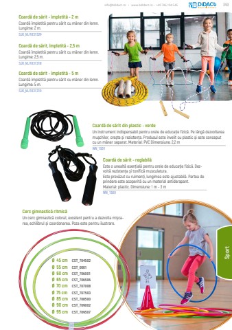 info@bdidact.ro %u2022 www.bdidact.ro %u2022 +40 746 104 545SportCoard%u0103 de s%u0103rit - %u00eempletit%u0103 - 2 mCoard%u0103 %u00eempletit%u0103 pentru s%u0103rit cu m%u00e2ner din lemn.Lungime: 2 m.SJK_MJ1831529Coard%u0103 de s%u0103rit, %u00eempletit%u0103 - 2,5 mCoard%u0103 %u00eempletit%u0103 pentru s%u0103rit cu m%u00e2ner din lemn. Lungime: 2,5 m.SJK_MJ1831318Coard%u0103 de s%u0103rit - %u00eempletit%u0103 - 5 mCoard%u0103 %u00eempletit%u0103 pentru s%u0103rit cu m%u00e2ner din lemn. Lungime: 5 m.SJK_MJ1831319Coard%u0103 de s%u0103rit - reglabil%u0103Este o unealt%u0103 esen%u021bial%u0103 pentru orele de educa%u021bie fizic%u0103. Dezvolt%u0103 rezisten%u021ba %u0219i tonific%u0103 musculatura.Este prev%u0103zut cu rulmen%u021bi, lungimea este ajustabil%u0103. Partea de prindere este acoperit%u0103 cu un material antiderapant.Material: plastic. Dimensiune: 1 m - 3 mWN_1500Coard%u0103 de s%u0103rit din plastic - verdeUn instrument indispensabil pentru orele de educa%u021bie fizic%u0103. Pe l%u00e2ng%u0103 dezvoltarea mu%u0219chilor, cre%u0219te %u0219i rezisten%u021ba. Produsul este %u00eenvelit cu plastic %u0219i este conceput cu un m%u00e2ner separat. Material: PVC Dimensiune: 2,2 mWN_1501Cerc gimnastic%u0103 ritmic%u0103 Un cerc gimnastic%u0103 colorat, excelent pentru a dezvolta mi%u0219carea, echilibrul %u0219i coordonarea. Poza este pentru ilustrare.%u00d8 45 cmCST_704502%u00d8 55 cmCST_0001%u00d8 60 cmCST_706001%u00d8 65 cmCST_706506%u00d8 70 cmCST_707008%u00d8 75 cmCST_707503%u00d8 85 cmCST_708500%u00d8 90 cmCST_709002%u00d8 95 cmCST_709507349