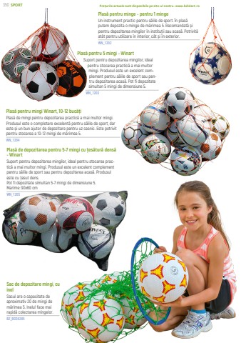 SPORTPre%u021burile actuale sunt disponibile pe site-ul nostru: www.bdidact.ro Plas%u0103 pentru minge - pentru 1 mingeUn instrument practic pentru s%u0103lile de sport. %u00cen plas%u0103 putem depozita o minge de m%u0103rimea 5. Recomandat%u0103 %u0219i pentru depozitarea mingilor %u00een institu%u021bii sau acas%u0103. Potrivit%u0103 at%u00e2t pentru utilizare %u00een interior, c%u00e2t %u0219i %u00een exterior.WN_1202Plas%u0103 pentru 5 mingi - WinartSuport pentru depozitarea mingilor, ideal pentru stocarea practic%u0103 a mai multor mingi. Produsul este un excelent complement pentru s%u0103lile de sport sau pentru depozitarea acas%u0103. Pot fi depozitate simultan 5 mingi de dimensiune 5.WN_1203Plas%u0103 pentru mingi Winart, 10-12 buc%u0103%u021biPlas%u0103 de mingi pentru depozitarea practic%u0103 a mai multor mingi. Produsul este o completare excelent%u0103 pentru s%u0103lile de sport, dar este %u0219i un bun ajutor de depozitare pentru uz casnic. Este potrivit pentru stocarea a 10-12 mingi de m%u0103rimea 5.WN_1204Plas%u0103 de depozitarea pentru 5-7 mingi cu %u021bes%u0103tur%u0103 dens%u0103 - WinartSuport pentru depozitarea mingilor, ideal pentru stocarea practic%u0103 a mai multor mingi. Produsul este un excelent complement pentru s%u0103lile de sport sau pentru depozitarea acas%u0103. Produsul este cu %u021besut dens.Pot fi depozitate simultan 5-7 mingi de dimensiune 5.Marime: 90x60 cmWN_1205Sac de depozitare mingi, cu inelSacul are o capacitate de aproximativ 20 de mingi de m%u0103rimea 5. Inelul face mai rapid%u0103 colectarea mingelor.BZ_BD36285350