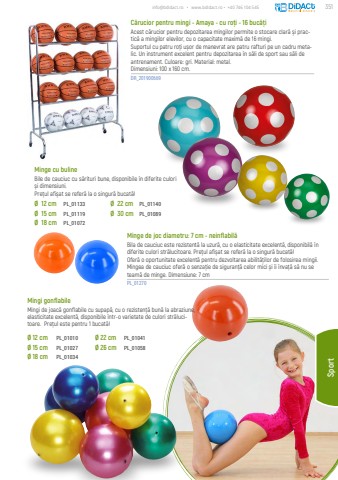 info@bdidact.ro %u2022 www.bdidact.ro %u2022 +40 746 104 545SportC%u0103rucior pentru mingi - Amaya - cu ro%u021bi - 16 buc%u0103%u021biAcest c%u0103rucior pentru depozitarea mingilor permite o stocare clar%u0103 %u0219i practic%u0103 a mingilor elevilor, cu o capacitate maxim%u0103 de 16 mingi.Suportul cu patru ro%u021bi u%u0219or de manevrat are patru rafturi pe un cadru metalic. Un instrument excelent pentru depozitarea %u00een s%u0103li de sport sau s%u0103li de antrenament. Culoare: gri. Material: metal.Dimensiuni: 100 x 160 cm.DR_201900669Minge cu bulineBile de cauciuc cu s%u0103rituri bune, disponibile %u00een diferite culori %u0219i dimensiuni.Pre%u021bul afi%u0219at se refer%u0103 la o singur%u0103 bucat%u0103!Mingi gonflabileMingi de joac%u0103 gonflabile cu supap%u0103, cu o rezisten%u021b%u0103 bun%u0103 la abraziune, elasticitate excelent%u0103, disponibile %u00eentr-o varietate de culori str%u0103lucitoare. Pre%u021bul este pentru 1 bucat%u0103!Minge de joc diametru: 7 cm - neinflabil%u0103Bila de cauciuc este rezistent%u0103 la uzur%u0103, cu o elasticitate excelent%u0103, disponibil%u0103 %u00een diferite culori str%u0103lucitoare. Pre%u021bul afi%u0219at se refer%u0103 la o singur%u0103 bucat%u0103!Ofer%u0103 o oportunitate excelent%u0103 pentru dezvoltarea abilit%u0103%u021bilor de folosirea mingii. Mingea de cauciuc ofer%u0103 o senza%u021bie de siguran%u021b%u0103 celor mici %u0219i %u00eei %u00eenva%u021b%u0103 s%u0103 nu se team%u0103 de minge. Dimensiune: 7 cmPL_01270%u00d8 12 cm PL_01010%u00d8 15 cm PL_01027%u00d8 18 cm PL_01034%u00d8 22 cm PL_01041%u00d8 26 cm PL_01058%u00d8 12 cmPL_01133%u00d8 15 cmPL_01119%u00d8 18 cmPL_01072%u00d8 22 cmPL_01140%u00d8 30 cmPL_01089351