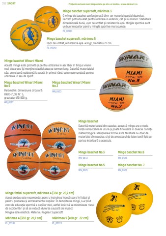 SPORTPre%u021burile actuale sunt disponibile pe site-ul nostru: www.bdidact.ro Minge baschet supersoft, m%u0103rimea 3O minge de baschet confec%u021bionat%u0103 dintr-un material special dezvoltat. Perfect potrivit%u0103 at%u00e2t pentru utilizare %u00een exterior, c%u00e2t %u0219i %u00een interior. Stabilitate dimensional%u0103 bun%u0103, u%u0219or de umflat %u0219i rezistent la ap%u0103. Mingile sportive sunt un bun %u00eenlocuitor pentru mingile sportive mai scumpe.PL_02031Minge baschet supersoft, m%u0103rimea 5U%u0219or de umflat, rezistent la ap%u0103. 450 gr, diametru 22 cm.PL_04240Minge baschet Winart MiamiAcest%u0103 minge este potrivit%u0103 %u0219i pentru utilizarea %u00een aer liber %u00een timpul vremii reci, deoarece %u00ee%u0219i men%u021bine elasticitatea pe termen lung. Datorit%u0103 materialului s%u0103u, are o bun%u0103 rezisten%u021b%u0103 la uzur%u0103. %u00cen primul r%u00e2nd, este recomandat%u0103 pentru utilizarea %u00een s%u0103li de sport.Minge baschetDatorit%u0103 materialului din cauciuc, aceast%u0103 minge are o rezisten%u021b%u0103 remarcabil%u0103 la uzur%u0103 %u0219i poate fi folosit%u0103 %u00een diverse condi%u021bii meteorologice. Men%u021binerea formei este facilitat%u0103 nu doar de materialul din cauciuc, ci %u0219i de amestecul de latex textil lipit pe partea interioar%u0103 a acestuia.Minge baschet Winart Miami No.5Parametrii: dimensiune circular%u0103: 69,00-71,00, Nr. 5; greutate: 470-500 g, WN_0622Minge baschet Winart Miami No.3WN_0623Minge baschet No.3WN_0613Minge baschet No.5WN_0625Minge baschet No.6WN_0626Minge baschet No. 7 WN_0627Minge fotbal supersoft, m%u0103rimea 4 (330 gr. 20,7 cm)Acest produs este recomandat pentru instruirea %u00eencep%u0103toare %u00een fotbal %u0219i pentru predarea %u0219i antrenamentul copiilor. %u00cen dezvoltarea mingii, s-a %u021binut cont de educa%u021bia sportiv%u0103 a copiilor mici, astfel %u00eenc%u00e2t s%u0103 se minimizeze riscul de accident%u0103ri %u0219i s%u0103 se reduc%u0103 durerea cauzat%u0103 de impact.Mingea este elastic%u0103. Material: Kogelan SupersoftM%u0103rimea 4 (330 gr. 20,7 cm)PL_03106Mi%u0103rimea 5 (400 gr. 22 cm)PL_03113352
