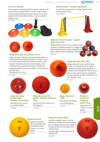 info@bdidact.ro %u2022 www.bdidact.ro %u2022 +40 746 104 545SportScar%u0103 de conuri - element suplimentarTransform%u0103-%u021bi conurile %u00eentr-un baraj! Element suplimentar pentru conuri.SJK_ST-20026-1Set conuri colorateSet de jaloane din plastic flexibil. %u00cen cazul %u00een care se calc%u0103 pe ele, discul se comprim%u0103 pur %u0219i simplu %u0219i apoi revine la forma ini%u021bial%u0103. Diametrul discului este de 19 cm. Setul con%u021bine 50 de jaloane (5x10 culori) %u0219i o tij%u0103 de sus%u021binere. %u00cen%u0103l%u021bime: 5 cmSJK_ST-051Minge de aruncat 85 g, diametru 12 cmMingea de sport hipersoft, conceput%u0103 special pentru a reduce durerea cauzat%u0103 de impactul cu corpul, cum ar fi %u00een cazul ap%u0103r%u0103rii. Materialul special al acestor mingi de sport hipersoft le face mai moi la impact, amelior%u00e2nd durerea asociat%u0103. Acest aspect contribuie la cre%u0219terea pl%u0103cerii %u0219i a bucuriei copiilor %u00een timpul jocului %u0219i al sportului.Dimensiuni: 12 cm, 85 gPL_03656Minge hipersoft, 18 cm, 120 gMingea hipersoft este o juc%u0103rie foarte moale, cu o experien%u021b%u0103 de joc sigur%u0103. Materialul de baz%u0103 special dezvoltat al mingilor sportive hypersoft face ca ciocnirile cu corpul s%u0103 fie mai moi, amelior%u00e2nd durerea asociat%u0103 acestora. Dimensiune: 18 cm. Greutate: 120 g.PL_03441Minge de aruncat - 100gFabricat din PVC, umplut cu un lichid special.PL_02093Minge de aruncat cu %u00eenveli%u0219 din plastic 120 gFabricat din PVC, umplut cu un lichid special.PL_02086Minge de aruncat (perete neted, diametru: 10 cm) 300 gFabricat din PVC, umplut cu un lichid special.PL_03052Minge de aruncat (18 panouri, diametru: 12,90 cm) 500 gFabricat din PVC, umplut cu un lichid special.PL_03069Minge de aruncat 32 panouri, diametru: 145 mm, greutate: 600 g %u00cenveli%u0219 din plastic, umplut cu un lichid specialPL_03304Minge de aruncat 800 gr Exerci%u021biul preg%u0103titor pentru jocurile sportive cu mingea este aruncarea mingii mici. Mingea trebuie s%u0103 fie aleas%u0103 %u00een func%u021bie de nivelul de dezvoltare %u0219i de condi%u021bia fizic%u0103.Greutate: 800 g. Dimensiune: 16,5 cm. Material: PVCPL_04257Minge de aruncat din piele - 4 panori, 100g, culori mixteMinge clasic%u0103 %u0219colar%u0103. Este un accesoriu esen%u021bial pentru predarea arunc%u0103rii cu mingea. Mingea are patru panouri %u0219i este cusut%u0103 din culori mixte. Material: piele. Dimensiune: 100 grame.WN_0727359