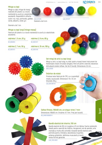 info@bdidact.ro %u2022 www.bdidact.ro %u2022 +40 746 104 545SportMinge cu %u021bepiMinge cu %u021bepi, minge de masaj, realizat%u0103 din plastic cu o bun%u0103 rezisten%u021b%u0103 la uzur%u0103 %u0219i o elasticitate excelent%u0103. Disponibil%u0103 %u00een diferite culori: roz, ro%u0219u, portocaliu, galben, verde, albastru, violet, gri. Diametru de 7 cm.SJK_ST-076Diametru de 9 cm.SJK_ST-077Minge cu %u021bepi lungi (minge masaj) Fabricat din plastic cu o bun%u0103 rezisten%u021b%u0103 la uzur%u0103 %u0219i o elasticitate excelent%u0103. m%u0103rimie 1, 5 cm, 20 gBZ_BD3093m%u0103rime 2, 7 cm, 50 gBZ_BD3161m%u0103rime 3, 8 cm, 85 gBZ_BD3107m%u0103rime 4, 10 cm, 165 gBZ_BD3108Set mingi de arici cu %u021bepi lungiMingi cu arici, cu %u021bepi lungi, nu doar pentru masaj! Acest instrument de fizioterapie cre%u0219te circula%u021bia s%u00e2ngelui, fiind util pentru exerci%u021bii, deoarece stimuleaz%u0103 zonele reflexe. Set de 12 buc%u0103%u021bi. Dimensiune: 5,5 cm. GOK_63935%u00cent%u0103ritor de m%u00e2n%u0103Produsul este fabricat din TPE, cu o suprafa%u021b%u0103 moale, cauciucat%u0103. Dimensiuni: 10 x 7,5 cm Greutate: 66 gSJK_NK-DBT-H1Band%u0103 elastic%u0103 de %u00eentarire, 150 cmBand%u0103 elastic%u0103 de 150 cm lungime %u0219i 15 cm l%u0103%u021bime, foarte rezistent%u0103. Ideal%u0103 pentru exerci%u021bii de %u00eent%u0103rire, recuperare, ore de aerobic, arte mar%u021biale %u0219i multe alte activit%u0103%u021bi. Aceast%u0103 band%u0103 elastic%u0103 este potrivit%u0103 pentru %u00eentindere, dezvoltarea mu%u0219chilor, arderea gr%u0103similor, definirea muscular%u0103 %u0219i men%u021binerea formei generale. SJK_YDS-0001Saltea fitness, 180x50 cm, un singur strat, 7 mmDimensiune: 180x50 cm. Grosime: 6-7 mm. Pre%u021b per bucat%u0103.DR_090010000014365