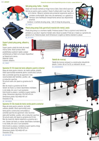 SPORTPre%u021burile actuale sunt disponibile pe site-ul nostru: www.bdidact.ro Set ping pong, Salta - FamilyAcest set include rachet%u0103 %u0219i minge marca Salta. Setul ofer%u0103 oportunit%u0103%u021bi de joc pentru patru juc%u0103tori. Poate fi utilizat at%u00e2t %u00een aer liber, c%u00e2t %u0219i %u00een interior. M%u00e2nerul rachetei este proiectat ergonomic pentru o prindere confortabil%u0103. Setul vine, de asemenea, cu o geant%u0103 cu fermoar care faciliteaz%u0103 transportarea setului sau depozitarea practic%u0103.Con%u021binut: 4 rachete de ping-pong - Salt; 8 mingi de ping-pongDS_140301Suport plas%u0103 ping-pong, albastru, SaltaSuport pentru plas%u0103 de tenis de mas%u0103 marca Salta. Acest produs ofer%u0103 posibilitatea sus%u021binerii rigide a plasei achizi%u021bionate %u0219i fix%u0103rii ei la mas%u0103. Dispozitivul se fixeaz%u0103 prin cleme.Material: metalCuloare: albastruDS_140041Plas%u0103 ping-pong Club, garnitur%u0103 masiv%u0103 din metal, JoolaPlas%u0103 ping-pong cu o montare rapid%u0103. Produsul poate fi fixat cu ajutorul unei tehnici de prindere cu %u0219uruburi. Suportul metalic este robust %u0219i poate fi fixat pe o mas%u0103 cu o grosime de p%u00e2n%u0103 la 6 cm. Material plas%u0103: textil Dimensiuni: lungime %u0219i l%u0103%u021bime standard a plaseiDS_JO-31006Masa de tenis pentru interior, de %u00eenalt%u0103 calitate, pliabil%u0103. Ofer%u0103 oportunit%u0103%u021bi excelente pentru construirea comunit%u0103%u021bii %u0219i activit%u0103%u021bi sportive de agrement. Este recomandat%u0103 at%u00e2t familiilor, %u0219colilor, c%u00e2t %u0219i cluburilor sportive.Structur%u0103 cadru din %u021beav%u0103 cu grosime de 25 mmBlat de mas%u0103 cu grosime de 19 mmSistem de fixare cu m%u00e2ner deschidere-%u00eenchidere4 ro%u021bi duble, din care 2 sunt pivotanteEste livrat%u0103 cu plas%u0103, o rachet%u0103 %u0219i suport pentru mingi. Dimensiuni deschis%u0103: 274%u00d7152,5%u00d776 cmDimensiuni pliat%u0103: 152,5%u00d766,5%u00d7187 cmGreutate: 67 kgDR_ 200100044Masa de tenis pentru exterior, de %u00eenalt%u0103 calitate, pliabil%u0103. Ofer%u0103 oportunit%u0103%u021bi excelente pentru construirea comunit%u0103%u021bii %u0219i activit%u0103%u021bi sportive de agrement. Este recomandat%u0103 at%u00e2t familiilor, %u0219colilor, c%u00e2t %u0219i cluburilor sportive.Structur%u0103 cadru din %u021beav%u0103 cu grosime de 25 mmBlat de mas%u0103 din r%u0103%u0219in%u0103 melanin%u0103 cu grosime de 4 mm. Sistem de fixare cu m%u00e2ner deschidere-%u00eenchidere4 ro%u021bi duble, din care 2 sunt pivotanteEste livrat%u0103 cu plas%u0103, o rachet%u0103 %u0219i suport pentru mingiDimensiuni deschis%u0103: 274%u00d7152,5%u00d776 cmDimensiuni pliat%u0103: 152,5%u00d766,5%u00d7187 cmGreutate: 50 kgDR_200100041Sponeta S1-13i mas%u0103 de tenis albastru pentru interiorSponeta S1-12e mas%u0103 de tenis verde pentru exteriorTabel%u0103 de marcajTabel%u0103 de marcaj compact cu construc%u021bie robust%u0103 din plastic. Contor de la 0 la 30, cu indicatori de set. DR_320600000018368
