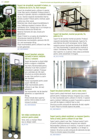 SPORTPre%u021burile actuale sunt disponibile pe site-ul nostru: www.bdidact.ro Suport de streetball, montabil %u00een beton, cu o %u00een%u0103l%u021bime de 0,6 m, fix, f%u0103r%u0103 man%u0219onSuport de streetball pentru utilizare %u00een special %u00een aer liber pentru streetball. Produsul poate fi cimentat %u00een p%u0103m%u00e2nt, oferind o modalitate stabil%u0103 de joc. Standul respect%u0103 standardele interna%u021bionale %u0219i poate fi folosit pentru institu%u021bii, spa%u021bii publice sau chiar acas%u0103.Materialul s%u0103u robust asigur%u0103 durabilitatea %u00een timp. %u00cen%u0103l%u021bimea standard a inelului: 305 cmExtinderea: 0,6 m. Standul vine cu un man%u0219on cu dimensiuni externe de 100%u00d760 mm. Material: Elemente din o%u021bel, zincate prin galvanizarePoate fi folosit cu un panou de streetball cu dimensiunea maxim%u0103 de 90%u00d7120 cm.Dimensiunea recomandat%u0103 a panoului: 90%u00d7120 cm. Inel recomandat: 80 kgPlas%u0103 recomandat%u0103: pentru utilizare %u00een aer liber, cu lan%u021b galvanizat.DR_100010000057Suport de baschet, montat pe perete, fix, p%u00e2n%u0103 la 2 mSuport fix de baschet montat pe perete. Produsul respect%u0103 standardele interna%u021bionale. Suportul fix este fabricat din profil rectangular %u00eenchis. Poate supporta panouri de baschet standard de 180x105 cm. Este recomandat %u00een special pentru institu%u021bii %u0219i cluburi. Extinderea: P%u00e2n%u0103 la 2 metri. Pre%u021bul include doar suportul, nu %u0219i panoul, inelul, plasa %u0219i protec%u021bia pentru um%u0103r prezentate %u00een imagine.DR_10/1/74-FIX2Suport baschet, exterior, turnabil %u00een beton, %u00een%u0103l%u021bime 1,65 m, 2 coloaneSuport de baschet cu dou%u0103 st%u00e2lpi pentru a asigura o stabilitate mai mare. Recomandat%u0103 pentru utilizarea %u00een aer liber %u0219i poate fi cimentat%u0103 %u00een p%u0103m%u00e2nt. Produsul are o extindere de 1,65 metri. Structura sa con%u021bine elemente de o%u021bel. Este conform cu cerin%u021bele standard.Panoul recomandat pentru acest suport: 180%u00d7105 cmPlas%u0103 recomandat%u0103: pentru utilizare %u00een aer liber, din lan%u021b galvanizatInel recomandat: inel de baschet galvanizat, cu capacitate de 180 kgPre%u021bul include doar suportul, panoul, inelul %u0219i plasa nu sunt incluse %u00een produs!DR_100010000038Suport de plas%u0103 combinat - pentru volei, tenisSuport pentru plas%u0103 interioar%u0103. Acest produs poate fi potrivit pentru %u00eenv%u0103%u021barea tenisului, tengoului sau a voleiului. Este recomandat pentru utilizare %u00een interior, %u00een special pentru institu%u021bii. %u00cen%u0103l%u021bimea sa poate fi ajustat%u0103 cu ajutorul unui %u0219tift de reglare a %u00een%u0103l%u021bimii fixat cu lan%u021b.Structura sa este compus%u0103 din elemente de o%u021bel, vopsite %u00een praf. Pre%u021bul nu include capacul de podea.DR_100010000101Suport pentru plas%u0103 combinat, cu manson (pentru tenis %u0219i volei), pentru utilizare %u00een aer liber.Suport pentru plas%u0103 %u00een aer liber. Produsul poate fi potrivit pentru %u00eenv%u0103%u021barea tenisului, tengoului sau voleiului. Recomand%u0103m utilizarea sa %u00een exterior, %u00een special %u00een cadrul institu%u021biilor. %u00cen%u0103l%u021bimea sa este reglabil%u0103, cu un design cu manson. Structura sa este compus%u0103 din elemente de o%u021bel. Pre%u021bul nu include capacul de podea!DR_100010000571Set st%u00e2lpi combinate de exterior pentru plas%u0103Tenis, volei, cu man%u0219on filetat sau cu design rulabil.GB_HT 010372