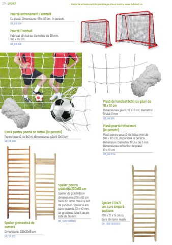 SPORTPre%u021burile actuale sunt disponibile pe site-ul nostru: www.bdidact.ro Poart%u0103 antrenament FloorballCu plas%u0103. Dimensiune: 115 x 90 cm. %u00cen perechi.GB_KA 004Poart%u0103 FloorballFabricat din tub cu diametrul de 28 mm. 160 x 115 cm.GB_KA 006Plas%u0103 pentru poart%u0103 de fotbal (%u00een perechi)Pentru poart%u0103 de 5x2 m, dimensiunea g%u0103urii 12x12 cmGB_HA 006Plas%u0103 de handbal 3x2m cu g%u0103uri de 10 x 10 cmDimensiunea g%u0103urii: 10 x 10 cm, diametrul firului: 3 mmGB_HA 004Plas%u0103 poart%u0103 fotbal mini (%u00een perechi)Plas%u0103 pentru poart%u0103 de fotbal mini de 140 x 100 cm, disponibil%u0103 %u00een perechi. Dimensiuni: Diametrul firului de 3 mm Dimensiunea ochiurilor de plas%u0103: 10 x 10 cmGB_HA 010vSpalier gimnastic%u0103 de camer%u0103Dimensiune: 230x72x15 cmGB_TF 003Spalier pentru gr%u0103dini%u021b%u0103 200x62 cmSpalier de gr%u0103dini%u021b%u0103 %u00een dimensiunea 200 x 62 cm bare din lemn masiv %u0219i set de %u0219uruburi. Spalierul are bare ovale de 32 x 40 mm, iar grosimea laturii de pin este de 36 mm.DR_10001000002Spalier 230x72 cm, cu o singur%u0103 sec%u021biune230 x 72 x 15 cm cu bare din lemn masiv.DR_100010000001374