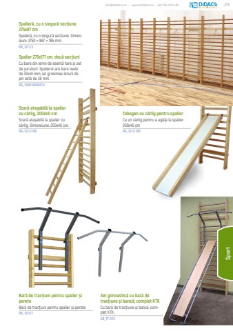 info@bdidact.ro %u2022 www.bdidact.ro %u2022 +40 746 104 545SportSpalier%u0103, cu o singur%u0103 sec%u021biune 275x87 cmSpalier%u0103, cu o singur%u0103 sec%u021biune. Dimensiuni: 2750 %u00d7 867 %u00d7 185 mmDR_10/1/3Spalier 275x171 cm, dou%u0103 sec%u021biuniCu bare din lemn de esen%u021b%u0103 tare %u0219i set de %u0219uruburi. Spalierul are bare ovale de 32x40 mm, iar grosimea laturii de pin este de 36 mm.DR_100010000015Scar%u0103 ata%u0219abil%u0103 la spalier cu c%u00e2rlig, 200x40 cmScar%u0103 ata%u0219abil%u0103 la spalier cu c%u00e2rlig. Dimensiune: 200x40 cm.DR_10/1/186Tobogan cu c%u00e2rlig pentru spalierCu un c%u00e2rlig pentru a ag%u0103%u021ba la spalier. 200x40 cmDR_10/1/185Bar%u0103 de trac%u021biuni pentru spalier %u0219i pereteBar%u0103 de trac%u021biuni pentru spalier %u0219i pereteDR_10/2/7Set gimnastic%u0103 cu bar%u0103 de trac%u021biune %u0219i banc%u0103, complet KTKCu bar%u0103 de trac%u021biune %u0219i banc%u0103, complet KTK.GB_TF 015375